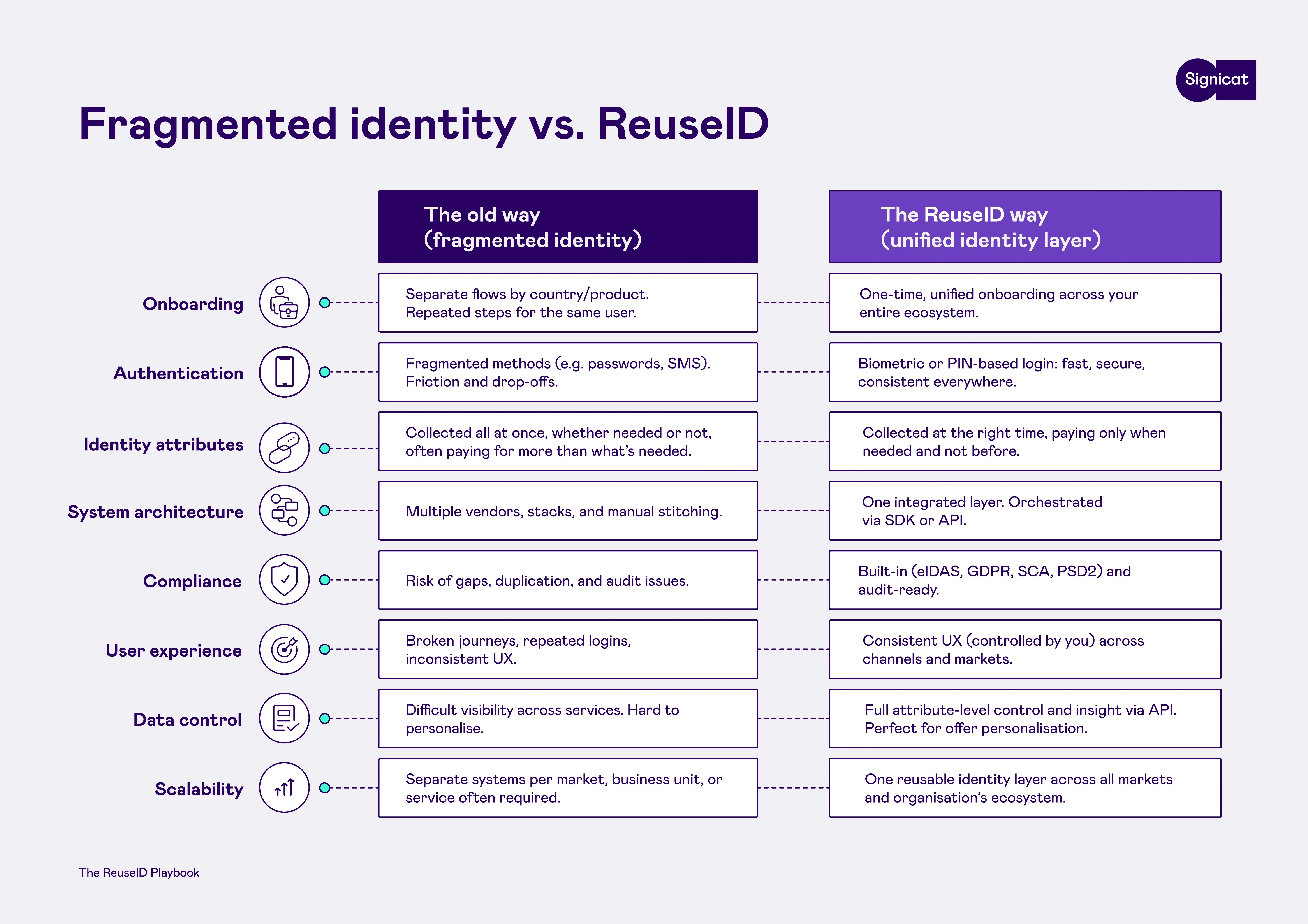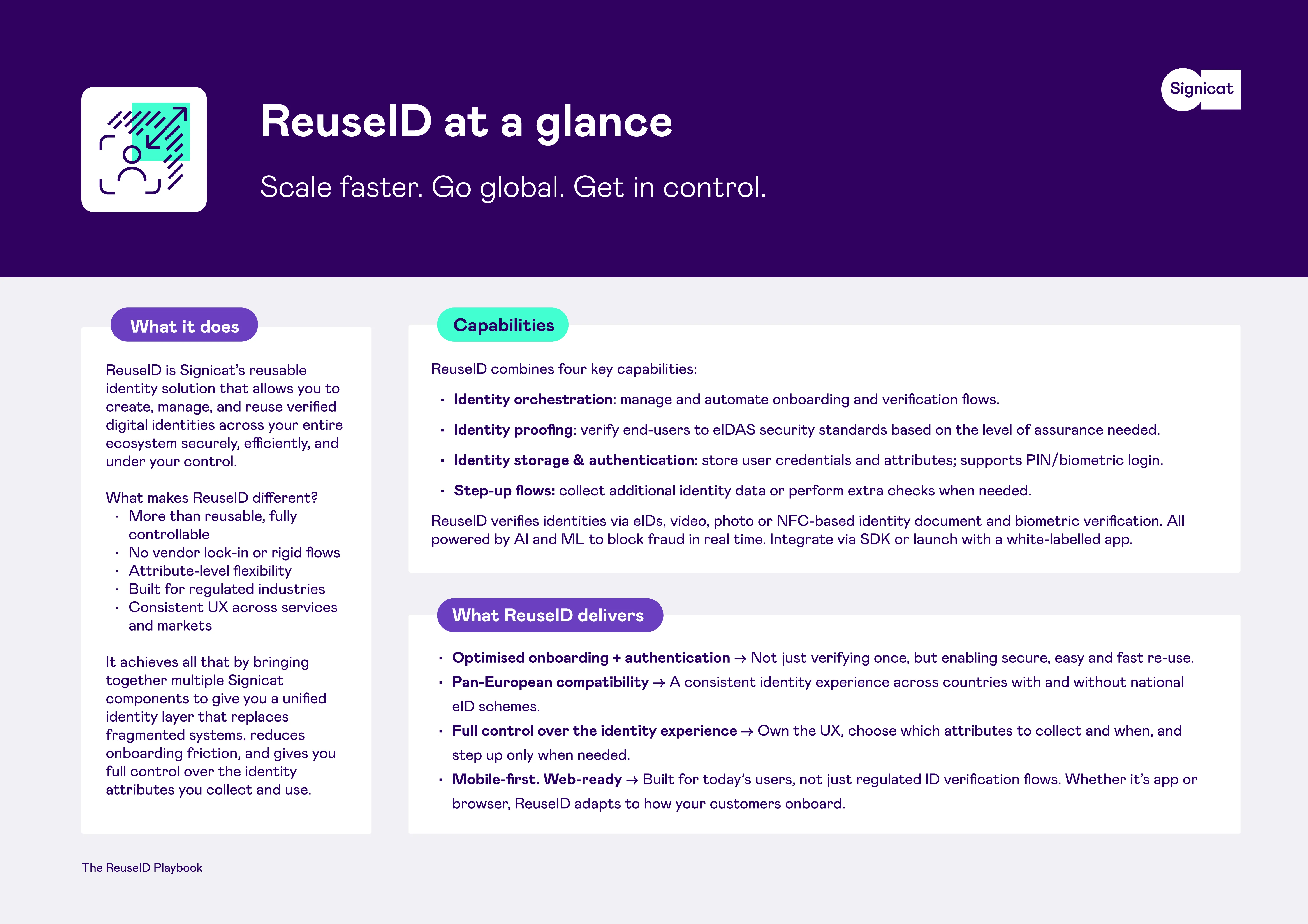 ReuseID by Signicat is a flexible identity platform built to work in any market. It gives organisations a single framework to manage identities, whether they are using established eIDs or building trust from the ground up with other identity methods.